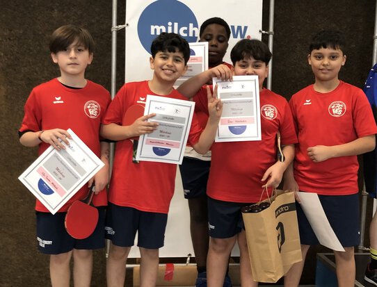 Die Kids der 3b gewannen beide Spiele gegen die Teams der 3a und 3c. Somit qualifizierten sich Beyza, Bekir, Jaron, Paul und Samuel als Gewinnerteam des 3. Jahrgangs für die nächste Runde des Tischtennis-Rundlaufturniers „Milchcup 2022“.