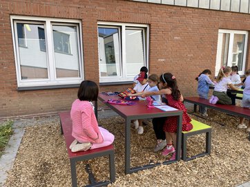 Dank des sonnigen Wetters hat sich unsere grüne Oase zu einem begehrten Lernort von ganzen Klassen oder auch Kleingruppen entwickelt. Das Lernen an der frischen Luft stellt eine schöne Abwechslung für die Kinder dar.